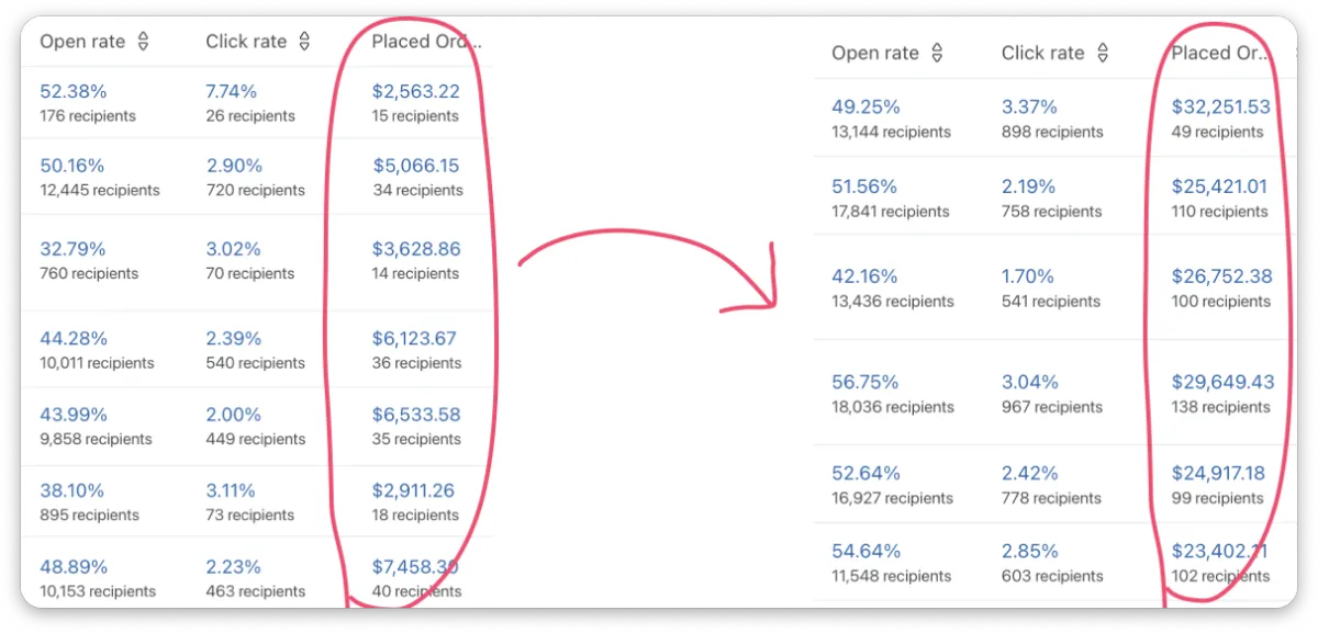 This brand went from thinking they topped out on their email marketing channel to seeing our flow and campaign split tests out perform their current angles, increasing their placed order rates across the board.